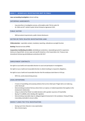 USYD WORK3206 - WORKPLACE LAW AND REGULATION Topics and summary (by week), and a simplified summary section of each major topic Weeks 1 - 12 (pages 1 - 27) - Introduction - Regulation of Work - Workplace Relationships - Rights and Obligations at Work - Work and Family - Discrimination - Workplace Investigation - Bargaining and Agreement Making - Termination - Future of Work and Regulation Topic Summaries (conclusion and overview) - pages 28 - 35 - Formation of Workplace Relationships - Regulation and Decent Work (Guy Standing) - Rights and Obligations - Work and Family - Discrimination - Health and Safety - Workplace Investigation - Bargaining and Decision making - Termination - Future Challenges Word Count 6569 Page Count 33