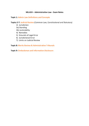 Complete and comprehensive summary of topics 1-9 (all topics). Notes are structured logically with topics flowing in the way that you would answer an exam question. All key cases and legislation included. Topics: Topic 1: Admin Law Definitions and Concepts Topics 2-7: Judicial Review 2)Jurisdiction 3a) Standing 3b) Justiciability 4)Remedies 5)Grounds of Legal Error 6)Jurisdictional Error 7)Limits on Judicial Review Topic 8: Merits Review & Administrative Tribunals Topic 9: Ombudsman and Information Disclosure