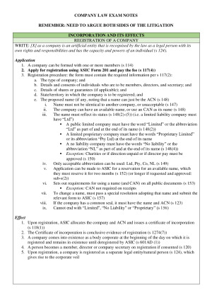 TOPICS INCLUDE - INCORPORATION AND ITS EFFECTS - TYPES OF COMPANIES - CONSTITUTION AND REPLACEABLE RULES - SHARE CAPITAL, DEBT CAPITAL AND DIVIDENDS - CORPORATE CONTRACTING - DIRECTORS, MEMBERS AND CORPORATE DECISION MAKING - DIRECTORS DUTIES - MEMBERS REMEDIES - CORPORATE MORTALITY