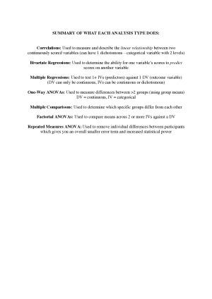 Notes were created using lecture, seminar and study guide materials Topics include: - Experimental and Non-Experimental Designs - Correlations, Bivariate Regression and Preliminary Data Analysis - Multiple Regression - Simple Analysis of Variance (One-Way ANOVA) - Multiple Comparisons Among Treatment Means - Factorial Simple Analysis of Variance (ANOVAs) - Repeated Measures and Mixed Model ANOVAs - Sampling - Surveys and Scales - Introduction to Qualitative Research