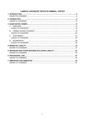 I completed this subject over the summer semester 2019/20 - High distinction grade These notes are organised, colour-coded, and easy to understand. They cover the readings and lecture notes for the semester, including the following topics: - Jurisdiction - Substantive crimes (genocide, crimes against humanity, war crimes, aggression) - Modes of liability - Defences and other groups excluding liability - Procedural law - Immunities and amnesties