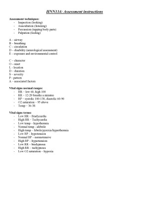These HNN114 notes are a fantastic resource for when your preparing for your hurdle. They are a great tool to refer to when practicing at home with a family member or friend. Really easy to follow. Body assessment process includes: - Abdominal assessment - Respiratory assessment - Cardiovascular assessment - Central neurological assessment - Musculoskeletal assessment - Neuro-vascular assessment - Nutrition, metabolism and elimination assessment