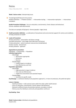 Includes the following topics Week 1 lecture notes: Underpinning issues Week 2 Lecture notes: Individuals and populations Week 3 Lecture notes: Environmental approaches to individuals and populations Week 4+5 no lecture break Week 6 Lecture Notes: Social Marketing and Health Funding by Industry Week 7 Lecture notes: Designing scalable health promotion interventions Week 8 Lecture notes: Evaluating Health promotion Interventions Week 9 no lecture break Week 10 Lecture notes: Guest lecture (Without trucks Australia stops) Week 11 Lecture notes: Health promotion challenges