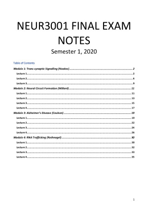 This comprehensive set of notes for Neur3001 covers all information needed for the final exam (which covers the second half of the course content). Modules covered includes: Trans-synaptic Signalling Neural Circuit Formation Alzheimer's Disease RNA Trafficking The notes are formatted in a way that is ideal for printing and highlighting/ annotating. Please note: these notes only cover the information needed for the final exam, not the mid-semester exam.