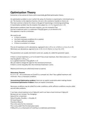 Covers all weeks, readings, lectures and tutorials. Topics include: - Matrix Algebra - Sets, functions and sequences - Continuous functions - Differentiable functions - Unconstrained optimisation theory - Constrained optimisation theory - Elementary integration