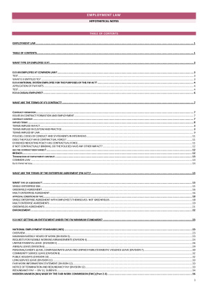 Topics include: - Type of Employee - Employment Contracts - Enterprise Agreements - Fair Work Minimum Standards - Adverse Action - Workplace Injury - Workplace Bullying - Unfair Dismissal - Enforcement of Fair Work Act - Discrimination Law