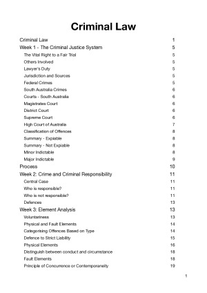 These notes cover all weeks of topics, such as the criminal justice system, crime and criminal responsibility, element analysis, homicide, dishonesty offences, offences against the person, sexual offences, attempts, affirmative defences, mental impairment, and all those therein.