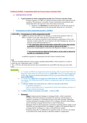 LAWS2017 Final Exam Summary Notes (Distinction) - SEMESTER 2, 2019. These notes concisely summarise the immense amount of content in the USYD Real Property course. These notes were used in the final exam and resulted in a distinction mark (80+). As seen in the preview, one of the most useful aspects of these notes is the inclusion of exam-ready scaffolds which will assist in quickly answering problem questions come time for the exam. Topics covered include: 1. Introduction and Fundamentals of Land Ownership 2. Torrens #1 (Elements; eConveyancing; Indefeasibility) 3. Torrens #2 (Assurance Fund; Unregistered Interests; Caveats; Priority Notices; Sources of Exceptions to Indefeasibility) 4. Torrens #3 (Fraud Exception to Indefeasibility; Personal Equities; R-G’s power of correction; Overriding statutes; Volunteers) Professor Gummow 5. Torrens #5 (Priorities between Unregistered interests) 6. Co-ownership 7. Easements and Profits à Prendre 8. Covenants 9. Leases 10. Mortgages