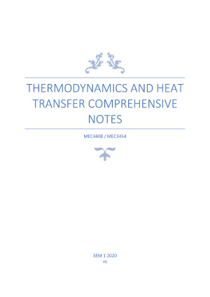 Complete Comprehensive notes covering all content in the MEC4408 / MEC3454 Thermodynamics and Heat Transfer course. Notes of a HD student currently employed in the industrial refrigeration sector, having a sound understanding of thermodynamics and heat transfer. These notes are very thorough and can be used to ensure that you have not missed any of the content throughout the semester. They have been compiled in chronological order so you can follow through with them as you go through the lectures and practical questions. The notes are also particularly helpful for exam revision as they include necessary formulas and how to use them. As well as some common assumptions that are required for answering questions. Good luck with your assessments