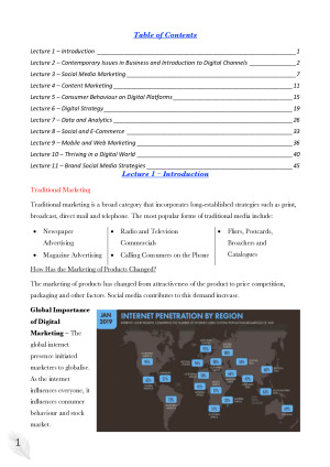 These are well-condensed but detailed notes on each topic to help prepare for final exams and complement your study for Digital Marketing and Social Media at University of Technology Sydney. The following notes contain diagrams and information to help clearly understand Digital Marketing and Social Media 24104 and includes notes from all lectures and tutorials. Specifically, the following topics are covered: 1) Introduction to Digital Marketing and Social Media 2) Contemporary Issues in Business and Marketing and Introduction to Digital Channels 3) Social Media Marketing 4) Content Marketing 5) Consumer Behaviour on Digital Platforms 6) Digital Strategy 7) Data and Analytics 8) Social and E-Commerce 9) Mobile Marketing and Web Marketing 10) Thriving in a Digital World 11) Brand Social Media Strategies 12) Review Lecture (NOT INCLUDED) Goodluck and thank you for using those notes. Note: The sample notes contain 10% of the complete notes.