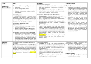 This concise table helps you understand how the contract topics fit together with a high level overview of each, topic the rules and the approach for the topics (with case citations). When studying contracts in 2010, I realised it’s easy to get overwhelmed with all the cases and topics and not understand how they are relevant and how they fit together in order to answer a problem question. So I created this table which I can quickly refer to when answering a problem question to make sure I’ve identified all the issues and have structured the issues in a logical sequence. Topics covered include: - Identifying Express Terms - Extrinsic Evidence - Construing Terms - Implied Terms - Frustration - Termination - Repudiation - Restrictions on Termination - Damages (including liquidated damages and debt) - Remoteness - Mitigation - Actions for Debt Note: This table may need updating to account for new cases or other topics, but at least this will give you a fuller picture of how to approach and understand these topics.