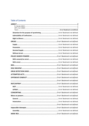 All charges covered in the 2019 course, with a flowchart of how to prove them (listing legislation (LEPRA, Evidence Act) and Common Law (Rondo; Carr; etc). Note - these notes are from 2019 so legislation may have been amended, and some cases may no longer be discussed. Covers: - Arrest - Drugs - Police Search Powers - Bail - Doli Incapax - Drug Detection Dogs - Attempted Acts -Offensive Conduct - Riot/Affray - Consorting - Move on Powers - Impossible Attempts - Mens Rea -Strict Liability - Absolute Liability - Actus Reus
