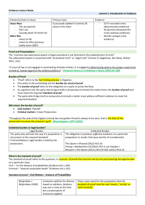 Detailed lecture notes for "Evidence". Easy to follow, with lecture commentary. Highly useful for tutorial preparation + problem questions. Topics covered: - Types of Evidence - Adducing Evidence - Witnesses - Relevance - Hearsay Rule - Credibility Rule - Opinion Rule - Discretionary/Mandatory Exclusions