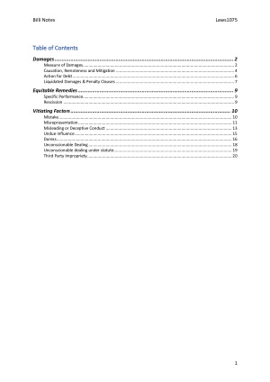 HD Color Coded Notes - Flowcharts covering all elements to cover/common law/legislation Damages 2 Measure of Damages 2 Causation, Remoteness and Mitigation 4 Action for Debt 6 Liquidated Damages & Penalty Clauses 7 Equitable Remedies 9 Specific Performance 9 Rescission 9 Vitiating Factors 10 Mistake 10 Misrepresentation 11 Misleading or Deceptive Conduct 13 Undue Influence 15 Duress 16 Unconscionable Dealing 18 Unconscionable dealing under statute 19 Third Party Impropriety 20