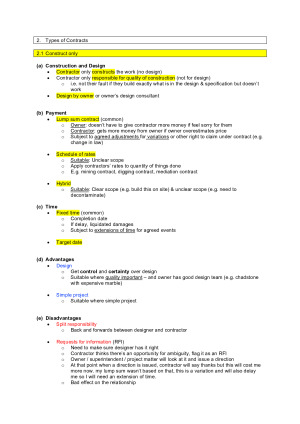 HD exam notes (89) for Construction Law. Full comprehensive exam script with word-by-word answers to help with the exam. These combine lecture notes and weekly readings, and topics covered include: 1. Introduction 2. Delivery Models 3. Time 4. Quality 5. Security of Payment 6. Variations 7. Regulation of the construction industry 8. Latent Conditions 9. Superintendents and Subcontractors 10. Security 11. Insurance 12. Duty of Care and Proportionate Liability
