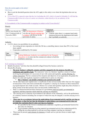 Exam notes I used for the final exam, which I received 90+ for. Topics include: Foundations: Application of ACL Conduct “in trade or commerce” Misleading & Deceptive Conduct - Evaluating “the class of consumers”; Evaluating “misleading or deceptive” Unconscionable conduct Unfair Contract Terms Regime Unsolicited consumer agreements Consumer guarantees regime Manufacturers liability for defective goods Consumer Remedies