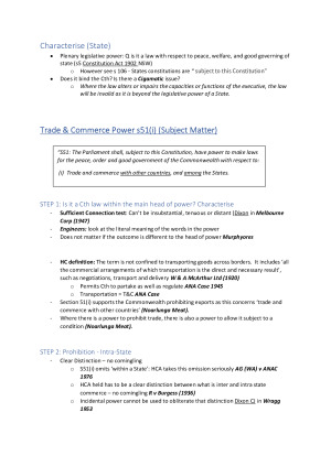 Issue Checklist + Step by Step process for every head of power, limitation etc! TABLE OF CONTENTS Issue Checklist 5 1. Is it a Commonwealth or a State law? Does the relevant Parliament have the power to enact the law in question? 5 2. Does the law breach an express constitutional prohibition? 5 3. Does the law breach any implied constitutional prohibition? 6 4. Do any issues arise as to the formalities of enacting the law? 6 5. If part of an Act or a provision is invalid, can it be severed or read down? 6 6. Is the law ineffective or inoperative for any other reason? 6 7. To whom does the law apply? 6 8. Is the law with regard to trading/commercial transactions? S51(i) 7 9. Is the law taking/spending money? 7 10. Is the law exacting money? 7 11. is the law with regard to military, terrorism, or defence? S51(vi) 7 Characterise (Cth) 8 Apply test: 8 If not, does the incidental power apply? 8 Characterise (State) 9 Trade & Commerce Power s51(i) (Subject Matter) 9 STEP 1: Is it a Cth law within the main head of power? Characterise 9 STEP 2: Prohibition - Intra-State 9 Step 3: Incidental Power 10 Activities Preliminary to Trade 10 STEP 3: acknowledge Murphy’s dissent in A-G (WA) (1976) 10 STEP 4: Prohibitions 10 STEP 5: Can it be severed or read down 10 STEP6: acknowledge relevance of T&C Power? 11 Freedom of Inter-State Trade s92 (Limitation) 11 Inter-State Trade & Commerce 11 STEP 1: Is the law contrary to the guarantee of freedom of inter-course between the States? 11 Intercourse among the States 11 Which test applies when there is both trade and commerce and intercourse? 12 STEP 1: Determine if is protectionist 12 STEP 2: If protectionist, determine if an exception applies 12 External Affairs Power s51(xxix) (Subject Matter + Purposive) 12 STEP 1: Is it a Cth law within the main head of power? Characterise 13 Geographically external to Australia 13 Relations with foreign governments 13 Polyukhovich Issue: nexus? 13 Alqudsi issue: proportionality test? 14 Step 2: sufficient specificity to direct a general course of action? 14 Treaties 14 STEP 1: characterise (implementing) 14 STEP 2: Is the Act implementing the treaty sufficiently specific? 14 STEP 3: is the law reasonably appropriate and adapted to achieving the treaty? (Reasonable proportionality) 14 Defence Power s51(vi) (Purposive) 15 Overview of the Constitutional provisions re defence 16 STEP 1: is there hostility/threat/war 16 STEP 2: is the law reasonably appropriate and adapted 17 STEP 3: does it fit within a primary or secondary aspect? 17 STEP 4: is it invalid for any other reason? 17 NB: Nationhood Power 17 STEP 5: Prohibitions 18 STEP 6: Can it be severed or read down 18 Nationhood Power s61 and s51(xxxix) (Purposive) 18 STEP 1: AAP Case Test “peculiarly adapted’ 19 STEP 2: Proportionality Test 19 STEP 3: Prohibitions 19 STEP 4: Can it be severed or read down 19 Corporations Power s51(xx) (Subject Matter Power) 20 STEP 1: is the law with respect to a corporation? 20 is it a foreign, trading or financial corporation? 20 What if the corporation has no activities? 21 Can a government body be a trading corporation? 21 Are certain bodies excluded from the definition of ‘trading corporation’? 21 Lower courts and a more liberal test 21 STEP 2: Characterise - Does the law fall within the scope of the corporations power? (sufficient connection) 21 Scope of the corporation’s power 21 Does it fit into any of the below? 22 What about incorporating companies? 22 STEP 4: Prohibitions 23 STEP 5: Can it be severed or read down 23 Race Power s51(xxvi) (Subject Matter Power) 23 STEP 1: Characterise 24 STEP 2: is it a special law? 24 STEP 3: is it about a ‘race’? 24 STEP 4: is it to a race’s benefit or detriment? 24 STEP 5: is it proportionate? 24 STEP 6: is it necessary? 25 STEP 4: Prohibitions 25 STEP 5: Can it be severed or read down 25 Appropriations Power s81 & s83 26 STEP 1: What type of appropriation bill is it? 26 Ordinary Annual Services of Government 26 ‘Standing’ or ‘special’ appropriation. 26 STEP 2: Does the appropriation have a spending power? 27 Ordinary functions of government 27 Nationhood Power 27 Urgent need to spend 27 Grants Power s96 28 Incidental Power 28 STEP 1: Constitutional Limitations 28 S51(xxxi) Just Terms 28 Does the grant discriminate between States? 29 Is the grant a scheme? 29 Is the Act coercive? 30 Taxation s51(ii) 30 STEP 1: Characterise 30 Is it a tax? 31 Or is it a fee for a service? 31 Is there a public purpose? 31 STEP 2: Constitutional Limits 32 STEP 3: Ramification 32 Excise Duties s90 (limitation for State) 32 STEP 1: What is an excise? 32 STEP 2: Is a State’s trying to slip through an excise? Invalid under s90 33 As a Business Franchise or licence fee? 33 Compulsory Acquisition of Property s51(xxxi) (grant + limitation) 33 STEP 1: interaction with other heads of power (rule of thumb) 34 STEP 2: is it property? 34 Statutory Rights 34 STEP 2: was it acquired? 34 STEP 3: Does it fall under an exception to s51(xxxi)? 35 STEP 4: Did the payment amount to ‘just terms?’ 35 Implied Freedom of Political Communication 36 STEP 1: Does law effectively burden freedom in its terms, operation or effect? Lange modified by McCloy 36 If yes, STEP 2: Is the purpose of the law legitimate in the sense that it is compatible with the maintenance of the constitutionally prescribed system of representative and responsible government? (Lange, McCloy, Brown) 36 If “yes”, STEP 3: is the law reasonably appropriate and adapted to advance that legitimate object in a manner that is compatible with the maintenance of the constitutionally prescribed system of representative and responsible government? (Lange) 37 Structured Proportionality 37 In applying 3, Brown majority considered that one should enquire whether the law is justified as (a) suitable; (b) necessary; and (c) adequate in its balance (McCloy, Brown, Clubb) 37 Freedom of Religion s116 37 1. Make any law establishing a Religion 37 2. Make