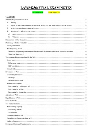 HD Notes that are simplified and easy to follow along for all sections of the exam - has the law and the cases (with a summary of facts and main points to take away from it). Contains both ACT and NSW legislation - which are highlighted throughout the notes so you can address the question with the correct legislation! Topics included: - Statutory requirements for wills - presumption of due execution - dispensing with formalities - testamentary dispositions outside the will - revocation and alteration of wills - mental elements - probate and letters of administration - executors and administrative duties - classification of gifts - failure of gifts - text and meaning of the will - family provision - intestacy