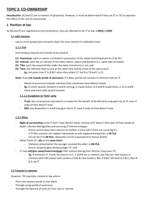 Very clear, concise notes that have every relevant case law and statutory provisions necessary to get a HD on the exam. These notes have made it very easy for you to answer questions in the exam, where you will simply need to substitute party names/facts into the pre-written answer format for you ( [P] will be eligible for claim as [D] did [facts]). Also includes short case summaries if needed to analogise with facts in the exam question. TOPIC LIST: Topic 1: Equitable interests (resulting/constructive trusts, remedies) Topic 2: Co-ownership (position at law/equity, severance, termination, rights & duties) Topic 3: Mortgages (rights of mortgages upon default) Topic 4: Enforceability of proprietary interests (Register: certificates of title) Topic 5: Indefeasibility (principle of indefeasibility, deferred & immediate, scope) Topic 6: Exceptions to indefeasibility (statutory fraud, verification of ID, in personam, paramount interests, inconsistent legislation, registrar's power to correct errors, volunteers, compensation) Topic 7: Priority disputes (protection of unregistered interests, equitable v equitable interests, prior equity v subsequent, mortgagor v purchaser from mortgagee)