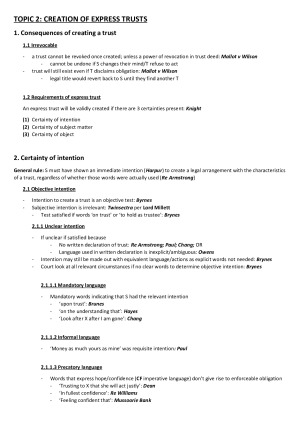 Very clear and concise trusts law notes. These notes made it easy for me to confidently answer exam questions, and are formatted in a way that is step-by-step and visually pleasing, easing your stress during exam period. All relevant cases and legislation is included, and was done in reference to the reading guide. TOPIC LIST: Topic 1: Not examinable Topic 2: Creation of express trusts (certainty of intention/subject matter) Topic 3: Trust structures (fixed interest, discretionary, bare power) Topic : Certainty of objects & quistclose trusts & charitable trusts Topic 4: Statutory formalities (creation/disposal of land, declaration of trust, disposition of a subsisting interest, sub-trusts) Topic 5: Constitution of trusts (legal property, equitable property, future property) Topic 6: Trustee's duties (duty to: comply with deed, avoid conflicts of interest, act gratuitously, act personally, act in interest of beneficiary, get in assets, act prudently, seek advice, act impartially, keep accounts & inform) Topic 7: Defences & limitations on liability (exclusion clauses) Topic 8: Rights of trustees (right of indemnity, right to approach the Court) Topic 9: Rights of beneficiaries (right to call for trust property, right to remove trustees) Topic 10: Remedies (personal/proprietary remedies, tracing)