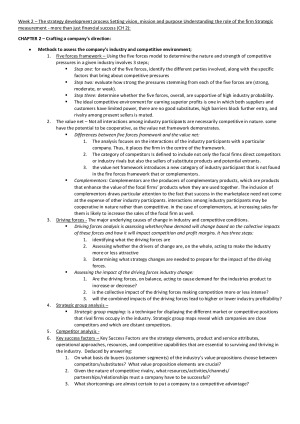 Notes include weeks 1-12 lectures and include notes from the assigned readings of the textbook/s. Relevant chapters are clearly displayed. Tutorial material is included where appropriate. Topics: Week 1 – Strategy - Introduction What is strategy and why its it important The role of strategy in defining the organisation's future direction (CH 1): Week 2 – The strategy development process Setting vision, mission and purpose Understanding the role of the firm Strategic measurement - more than just financial success (CH 2): Week 3 – The strategy development process (CH 3): Week 4 – The Strategy Analyses and Insight: (CH 4): Week 5 –The Strategy toolkit (Sources of competitive advantage, exploiting it and generic strategy options): (CH 5 & 6): Week 6 – The Borderless Strategic Organisation Drivers and risks of competing across borders The digital transformation and impacts on strategy Recognising and competing successfully in 'Blue Oceans': (CH 7): Week 7 – Strategy & Structure Understanding the relationships between strategy and structure Structuring the organisation for strategic effectiveness The different layers of strategic responsibility and focus: (CH 8): Week 8 – Strategy & Shared Value The notion of social license to operate Who 'owns' the organisation? Stakeholder views of the organisation's strategy Ethics, social responsibility and sustainability: (CH 9): Week 9 – Strategic execution/implementation Understanding the 7S framework Aligning people/capabilities, resources, systems and structures Measuring and monitoring strategic success: (CH 10 & 11): Week 10 – Strategic Culture and Leadership Defining leadership and how it differs from management Contemporary models of leadership The impact of culture or strategy Creating and sustaining an effective strategy culture: (CH 12): Week 11 – Contemporary issues in strategy The evolving nature of strategy and strategic management The agenda for strategic management in 2020 and beyond The agile strategic professional: (CH N/A - Readings): Week 12 – Revision