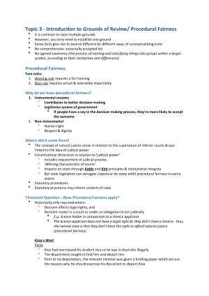 Topic 1 – Introduction to Admin Law Topic 2 – Introduction to Judicial Review Topic 3 – Introduction to Grounds of Review/Procedural Fairness Topic 4 – Error in Determining the Scope of Power Topic 5 – Determining Scope of Power (continued) Topic 6 – Consequences of Unlawful Action (Remedies) Topic 7 – Jurisdictional Error Topic 8 – Merits Review & Administrative Tribunals Topic 9 – Ombudsman Topic 10 – Information