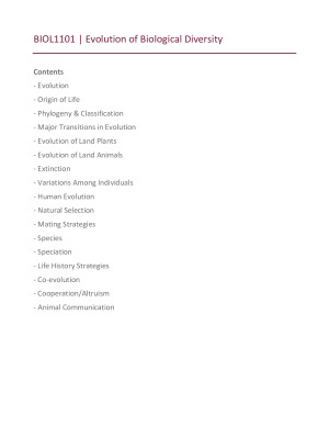 All BIOL1101 semester notes condensed into summary form that is suitable for exam study. Covers all weeks and lectures. Topics covered - Evolution - Origin of Life - Phylogeny & Classification - Major Transitions in Evolution - Evolution of Land Plants - Evolution of Land Animals - Extinction - Variations Among Individuals - Human Evolution - Natural Selection - Mating Strategies - Species - Speciation - Life History Strategies - Co-evolution - Cooperation/Altruism - Animal Communication