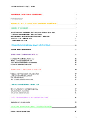 Comprehensive seminar notes for International Human Rights Law. These were compiled using the set textbook, weekly narrated powerpoints and class discussion. These notes will help you to understand the weekly topics, which are incredibly interesting. They will also help with weekly participation and class exercises, as well as the assessment and exam. Colour co-ordinated and with easy to follow headings. The scaffold includes the contents page and the first page of each topic.