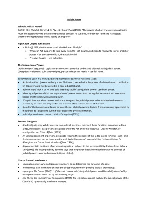 Concise exam notes which includes all relevant case law Topics covered - Judicial Power - Trade and Commerce Power - Defence Power - External Affairs - Acquisition on Just Terms - Characterisation - Federalism/ Intergovernmental Immunities/ Melbourne Cooperation’s Doctrine - Section 109 Inconsistency - Trial by Jury