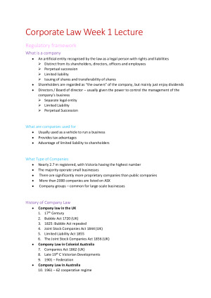 What is a company History of company law Regulators Types of business structures Types of companies Constitution and replaceable rules Fundraising Membership Dividends Debentures Directors and their duties Corporate governance Insolvent trading Remedies and penalties for a breach of directors duties Membership meetings ASIC Corporate insolvency