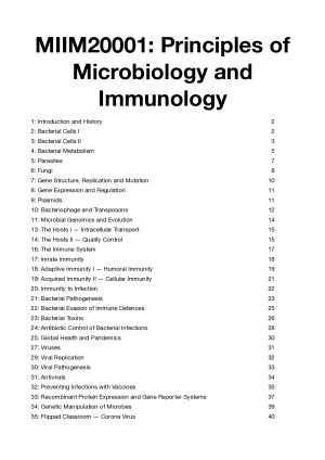 These notes comprehensively and concisely cover all 12 weeks of lecture content. The text is brightly colour coded to assist with memory and clarity. Dot points and lists are frequently used to help make sense of the more complicated topics. I used these notes to achieve an H1 in Principles of Microbiology & Immunology in semester 1 of 2020. Colour code key is included at the end of the document. Topics covered include: - introduction and history - bacterial cells - bacterial metabolism - parasites - fungi - gene structure, replication and mutation - gene expression and regulation - plasmids - bacteriophage and transposons - microbial genomics and evolution - the hosts - the immune system - innate immunity - adaptive immunity - immunity to infection - bacterial pathogenesis, invasion and evasion - bacterial toxins - antibiotic control - global health and pandemics - virus replication and pathogenesis - antivirals - vaccines - recombinant protein expression - genetic manipulation of microbes - corona virus