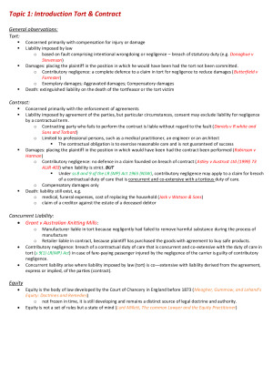 These course notes were created completely followed the outline and useful for both LLB and JD students. The notes are straightforward to read and search in the daily revision: Green as the statutory authorities Red as common law cases Also, you'll find everything from a topic in one page or so. Good Luck to your studies. Note: there is no case summary only principles, therefore don't purchase it if you'd like to read case summaries. This notes is made mainly for exam preparation. Topics include: Topic 1 Introduction: Tort And Contract Topic 2 Causation and Remoteness of Damage in Contract Topic 3 Measure of Damages in Contract and Sums Fixed by Contract Topic 4 Introduction to Vitiating Factors and The Remedy of Rescission Topic 5 Vitiating Factors: Undue Influence, Unconscionable Transactions and Unfair Contract Terms Topic 6 Duress and Mistake Topic 7 Misrepresentation at Common Law and Statutory Liability for Misleading or Deceptive Conduct Topic 8 The Tort of Trespass to Land Topic 9 The Tort of Private Nuisance Topic 10 Tort Liability for Interference with Goods Topic 11 Liability in Tort for Purely Economic Loss 1: Deceit. Negligent Misstatements and Professional Negligence Topic 12 Liability in Negligence for Purely Economic Loss 2: Loss from Damage to Third Party Property or Third Party Injury Topic 13 Liability in Negligence for Purely Economic Loss 3: Duties off Care for Pure Economic Loss from Defective Structures and Products Topic 14 Multiple Wrongdoers: Proportionate Liability