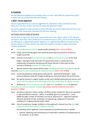 Coloured Skeleton Exam Notes for Administrative Law Topics included in notes: 1 Jurisdiction for ADJR Act 2 Jurisdiction for Common Law 3 Standing 4 Reasons 5 Narrow UV 5a Simple UV 5b Breach of Essential Procedural Condition 5c Delegation 6 Broad UV - Abuse of Power 6a Relevant and Irrelevant Considerations 6b Improper Purpose and Bad Faith 6c Unreasonableness 7 Broad UV - Fact-Finding Errors 7a No Evidence 7b the Jurisdictional Fact Concept 8 Broad UV - Discretion 8a Inflexible Application of Policy 8b Acting under Dictation 9 Procedural Fairness 9a Hearing Rule 9b Bias Rule 10 Jurisdictional Error 11 Remedies under ADJR Act 12 Remedies under CL 13 Privative Clauses 14 Merits Review