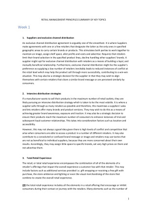 These notes are an excellent set of notes that will give you a rough summary of the key concepts covered in the unit. This is not a set of notes that covers the whole unit, although I am selling these too! These notes are best used when you are in your final few stages of revision and looking for some more information on the points that have been emphasised most throughout the unit. With these notes, I was able to achieve a score of 90% overall, which was the topic mark for Semester 1 of 2020. Please note, these are NOT an exhaustive list of examinable topics by any means. Anything from the unit may be examined. The topics covered are (key concepts from): 1. Introduction to retailing 2. Retail Strategy 3. The structure of the retail industry 4. Targeting consumers and gathering information 5. Locating the store 6. Managing a retail business 7. Retail Pricing 8. Retail Technology 9. Retail buying 10. In-store promotion and communication 11. Strategic integration, experiential retailing, retail brands 12. Trends in retailing