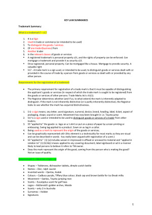 These notes include summaries from the topics that were examinable in Semester 1 of 2020 (which was also an open book exam). It includes summarised information from the lectures and tutes, alongside the unit textbook. These are the notes that enabled me to sit the exam with confidence. They are thorough and formulaic and tell you exactly how to apply the case laws. Please note, the summarised information from the cases are NOT included, but they are cited by case name so that they can be referred to. Topics included are: 1. Copyright 2. Designs 3. Advertising 4. Passing Off 5. Trademarks