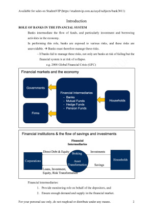 Because we did not have a mid-semester exam for Semester 1 2020 due to Covid-19, our final exam covered all topics since the beginning of the semester. This note that you are about to purchase is a condensed study note for all topics introduced in the unit of study. (I received an HD (87) for the final exam.) Will definitely help you heaps with understanding all the concepts, models, mathematical formulas, etc. being introduced to you in lectures and discussed in tutorials! Topic 1: Introduction (Chapter 1) Topic 2A: Interest rate risk: Repricing and maturity model (Chapter 8 + Appendix 8A) Topic 2B: Interest rate risk: Duration model (Chapter 9) Topic 3: Market risk (Chapter 15) Topic 4A: Credit risk: Individual loan (Chapter 10) Topic 4B: Credit risk: Loan portfolio (Chapter 11) Topic 4C: Credit risk: Management techniques (Chapter 24 & 26) Topic 5: Sovereign risk (Chapter 14) Topic 6: Liquidity risk (Chapter 12) Topic 7: Deposit insurance and other liability guarantees (Chapter 19) Topic 8: Capital adequacy (Chapter 20) Included: all that you need to get top marks for this unit of study (content summary, risk models, formula (with detailed step-by-step breakdown), study tips ... you name it!) Excluded: irrelevant details that won't help you score higher on your exam, anything that goes against Academic Honesty in Coursework Policy 2015 (assignments, exam questions, and exam responses). Again, perfect for getting a grasp of the course content and exam revision. Please do not re-upload this note or distribute it under any other means. I worked extremely hard for this high-quality note. Highly appreciated and best of luck with your study!