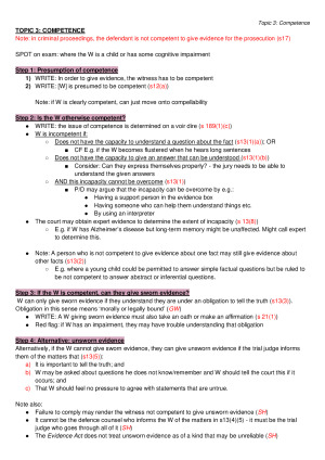 Very structured evidence notes (summarising all important information from Jonathan Clough's lectures, readings, tutorials and LSS) Structured in a checklist manner that will allow all the relevant issues to be easily identified. Includes pre-formulated sentence structures to allow for an efficient answer in an exam (whilst maximising marks). Topic 1: Introduction Topic 2: Relevance Topic 3: Competence and Compellability Topic 4: Privilege Topic 5: Examination of Witnesses Topic 6: Credibility and Character Topic 7: Right to Silence Topic 8: Tendency and Coincidence Topic 9: Hearsay Topic 10: Admissions Topic 11: Illegally Obtained Evidence Topic 12: Opinion Evidence Note: all the readings from the prescribed textbook were summarised so no further study should be required.