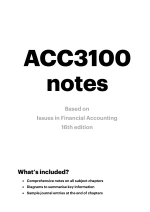 These notes were carefully crafted and used throughout the semester and the final exam to score 90% on the unit. Included in this document you will find: • Comprehensive notes on all chapters used in the subject (Issues in Financial Accounting 16th edition, Henderson, et. al) • Diagrams to summarise key information • Sample journal entries at the end of chapters (Table of Contents in preview document does not show the full table.) Please enjoy these notes and good luck for the unit. I hope you find it as enjoyable as I did!