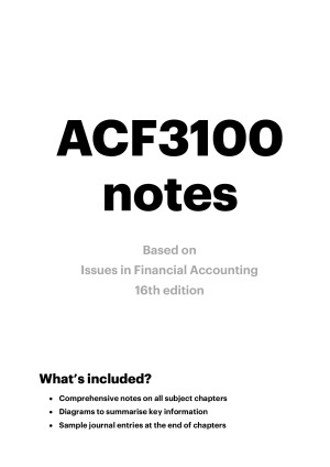 These notes were carefully crafted and used throughout the semester and the final exam to score 90% on the unit. Included in this document you will find: • Comprehensive notes on all chapters used in the subject (Issues in Financial Accounting 16th edition, Henderson, et. al) • Diagrams to summarise key information • Sample journal entries at the end of chapters (Table of Contents in preview document does not show the full table.) Please enjoy these notes and good luck for the unit. I hope you find it as enjoyable as I did!