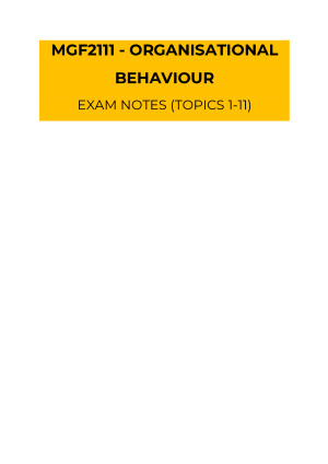 Hello !! These are extensive and colour organised notes of all content covered in weeks 1-11. This includes all you need to know for the final exam and the colours keep it engaging and easy to read. These are the notes I used to get a HD so hopefully, they can help you as well :) TOPICS INCLUDED: 1. Intro to OB 2. Self & Authenticity 3. Emotional Intelligence 4. Positive Psychology & Workplace Satisfaction 5. Judgement & Decision Making 6. Will Power & Work Motivation 7. Social Networking, Power & Politics 8. Group & Team Dynamics 9. Leadership Excellence 10. Business Ethics 11. Negotiation
