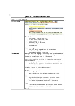 These notes are a summary of the key concepts for the final exam. These notes have been taken from the pre-class work on edge, lectures, textbook and readings, summarised to the most succinct and easy to read format. The final exam covers weeks 1, 2, 3, 12 and 13, which covers the topics of what is marketing, understanding customers and behaviour, designing for customers / customer experience, value creation and marketing innovation, respectively. Being an open book multiple choice exam, I found having my notes in this format was the easiest way to quickly flick through and get the right information.