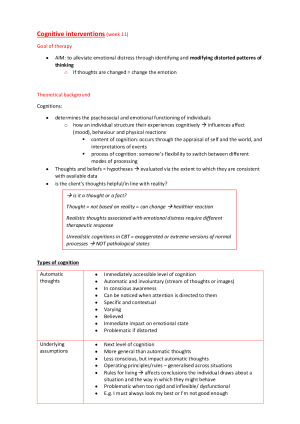Notes are from lectures and tutorials The information from each week has been organised into 5 different sections: - Theoretical background – the why does it work/ what do you use it for - Explain components of the therapy - Goal of strategy - Procedure of the strategy - Advantages and limitations of the strategy Includes visual representations of information ( flow charts, diagrams, boxes, visual layouts of information, etc) to enable a better and easier understanding of the content, and assist with memorising the content. Topics include: WAIS/WISC Clinical Assessment Questionnaires Case Formulation Symptom Management Cognitive Interventions Behavioural Experiments Exposure Behaviour Activation