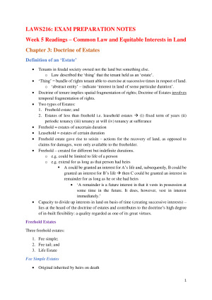 An amalgamation of Weeks 5-13 Property Law readings and lecture notes, extremely useful for your final exam preparation. Colour-coded (titles in purple, sub-titles in blue, statute in red and cases in green). Week 5 - Common Law and Equitable Interests in Land; Week 6 - Old System Priorities & Introduction to Torrens Title; Week 7 - Torrens Title (1): Indefeasibility and Exceptions; Week 8 - Torrens Title (2): Unregistered Interests and Priorities; Week 9 - Co-ownership and Strata Titles Week 10 - Leases and Residential Tenancy Week 11 - Mortgages Week 12 - Private Land Use Planning: Easements Week 13 - Private Land Use Planning: Freehold Covenants