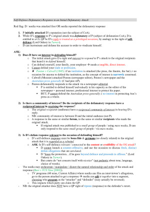 Extremely exam friendly templates that are easy to navigate. Key details, such as salient facts, important judicial statements or tips from the chief examiner, are included to help secure that HD point. Colour-coded with symbols and tables to draw your attention in a time-pressured exam (see my sample notes). Precise and succinct. These notes achieved my HD score! Topic List: CLASS TEST NOTES Opening matter 1. Defamatory Matter 2. Refer to Plaintiff 3. Standing for Plaintiff to Sue 4. Has Defamatory Matter been Published EXAM NOTES 5. Defamation Defences A) Truth B) Fair Comment C) Absolute Privilege D) Qualified Privilege E) Triviality 6) Defamation Remedies 7. Breach of Confidence