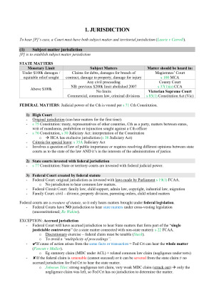 Extremely exam friendly templates that are easy to navigate. Key details, such as salient facts, important judicial statements or tips from the chief examiner, are included to help secure that HD point. Colour-coded with symbols and tables to draw your attention in a time-pressured exam (see my sample notes). Precise and succinct. These notes achieved my HD score! Topic List: Ethical & CPA Obligations and Case Management Principles 1. Jurisdiction 2. Instituting Proceedings 3. Parties and Causes of Action 4. Group Proceedings (Class Actions) 5. Service and Appearance 6. Pleadings 7. Discovery 8. Interlocutory Procedures 9. Disposition without Trial 10. Costs