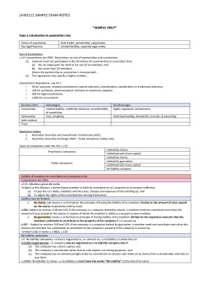 Complete and well-structured notes for LAW3112 (S1, 2020). Compiled and refined from lectures, tutorials, and personal research. Covers everything needed for all assessments. *Structured in a way that helps you work through the relevant legal issue step by step efficiently and thoroughly. Topics covered: 1. Introduction 2. Incorporation and its effects 3. Constitution and replaceable rules 4. Equity (Share) Capital versus Debt Capital 5. Directors, Members and Corporate decision making 6. Corporate Contracting 7. Directors Duties & Ratification and relief from liability 8. Members remedies 9. Corporate Mortality (unexaminable, but included) Hope it helps !! :)