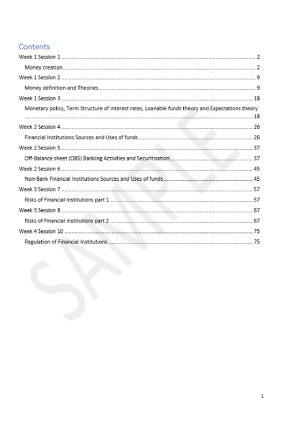Financial Institutions and Monetary Theory Notes. Highly detailed with full explanations provided. The following study material will ensure students are fully prepared for any upcoming tests and quizzes. Contents include: Week 1 - Session 1 (Money creation) Week 1 - Session 2 (Money definition and Theories) Week 1 - Session 3 (Monetary policy, Term strucutre of interest rates, Loanable funds theory and Expectations theory) Week 2 - Session 4 (Financial Insitutions Sources and Uses of funds) Week 2 - Session 5 (Off-balance sheet activities (OBS) Banking Activities and Securitisation) Week 2 - Session 6 (Non-bank Financial Insitutions Sources and Uses of funds) Week 3 - Session 7 (Risks of Financial Insitutions part 1) Week 3 - Session 8 (Risks of Financial Institutions part 2) Week 3 - Session 9 (No class content) Week 4 - Session 10 (Regulation of Financial Insitutions)