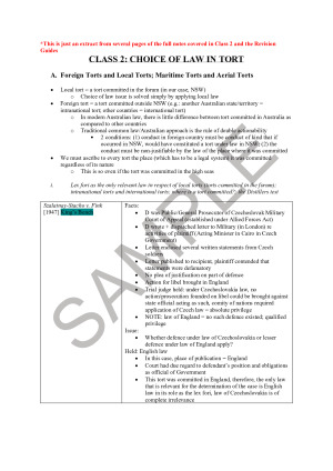 This set of notes are arranged according to Mr. Anderson's stream and include all examinable topics for Semester 1, 2020. Topics covered include: 1. Scope of private international law 2. Choice of law in tort 3. Personal jurisdiction 4. Substance and procedure 5. Proof of foreign law 6. Exclusionary doctrines 7. Choice of law in contract 8. Choice of law in contract 9. Foreign judgments *NOTE: For Topic 9 (foreign judgments), the following subtopics were non-examinable and are not included in this set of notes: statutory registration of foreign judgments, New Zealand judgments and interstate and territorial judgments. *To aid your revision, revision guides in the form of flow charts have been included in the final 2 pages of this set of notes and offer a bird's eye view of the main points to note amongst all examinable topics + 2 other subtopics (see sample notes for one of the flow charts) in an easy-to-read format. Good luck!