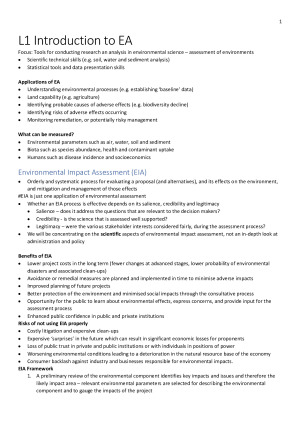 Complete Environmental Assessment Notes compiled by lecture topic and covering all important and examinable content. Topics include: * Introduction to Environmental Assessment * SoilsWest Seminar Notes * Urban Ecosystems * What to Analyse, and Why * Contaminant Bioavailability * Exploratory Data Analysis * Industry Perspectives of Environmental Assessment