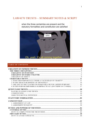 Detailed and comprehensive notes for Trusts. All topics are covered, including the creation of express trusts, Quistclose trusts, statutory formalities, constitution, duties and powers of trustees, defences, rights of trustees, rights of beneficiaries and remedies for breach of trust. These notes provide an in-depth overview of the course and are structured to be perfect for exams. References to cases and legislation are colour-coded for ease of reference, red flags to look for in problem questions are highlighted, and a suggested script is included.